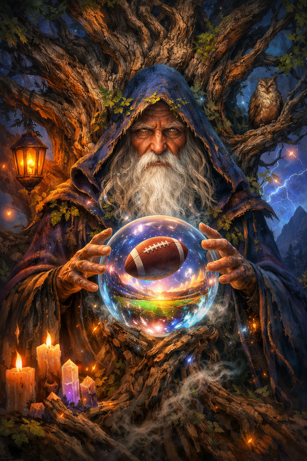 The Old Man's Crystal Ball uses a sophisticated two-part prediction system that combines 21 advanced factors to determine the winner with projected scoring metrics to calculate realistic spreads.